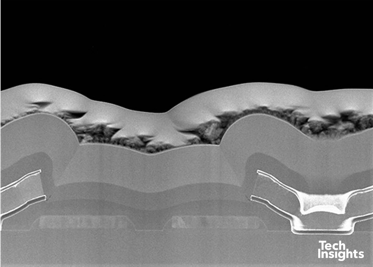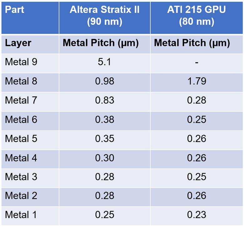 如往常,台積電在 90 nm 之前推出 110 nm 半節點(約 130 nm 的 10% 縮小)。此 NVIDIA 範例顯示其可能同時進行了 成本最佳化,因為並未使用低 k(對 GPU 來說稍顯意外)。相對地,其溝槽與通孔蝕刻精度明顯優於 ATI 的 130 nm 版本。
