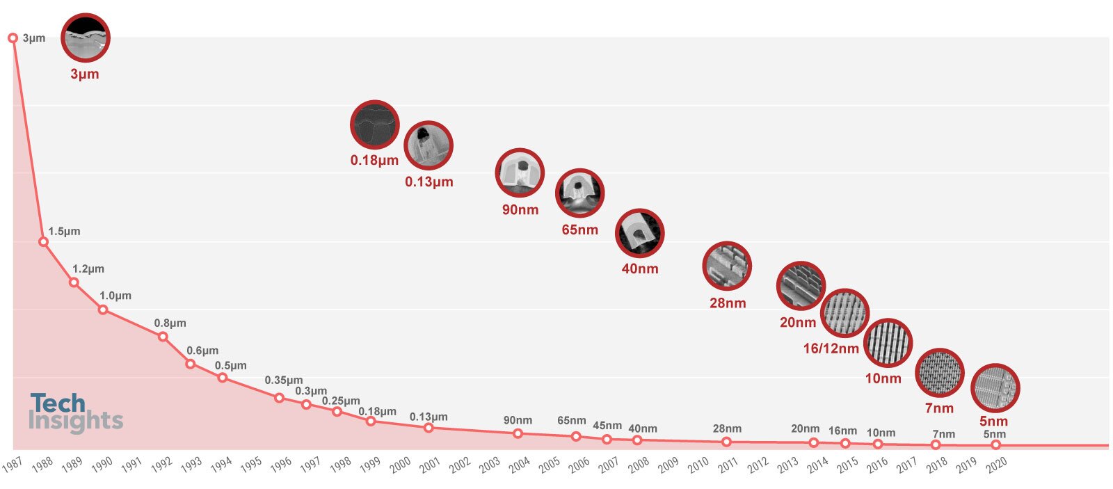 0.22 µm 與 0.18 µm:1998 年也開始量產 0.22 µm 製程,外觀與 0.25 µm 類似,但電晶體結構有所改變:仍使用 Ti salicide,但側牆間隔層(spacer)改為 L 形,不再是三角形。閘極長度已縮短至 0.16 µm,此時「節點名稱」與實際尺寸開始失去直接對應關係——在 0.25 µm 之前,閘長仍是相當可靠的世代指標。
