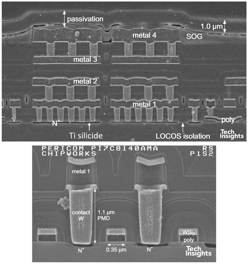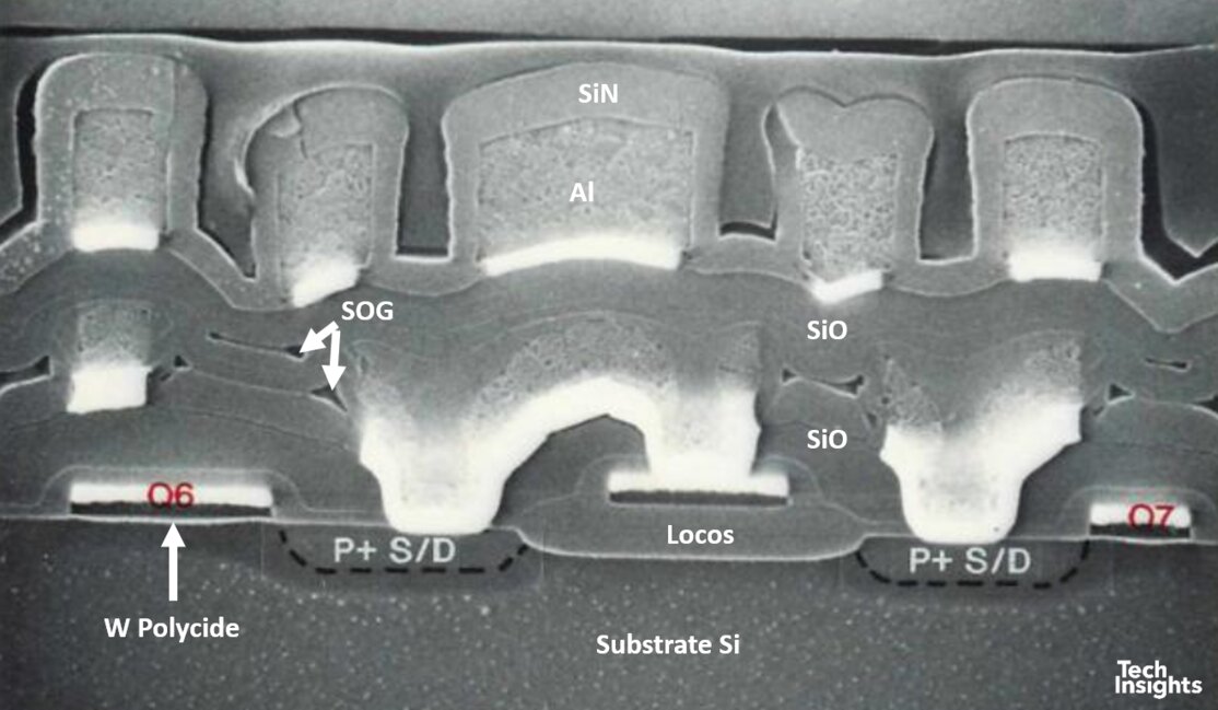 上述 Altera 的 EPLD 只使用 雙金屬層的 0.6 µm 製程。我們可以看到,當時的平坦化(planarization)主要依靠:流動玻璃(PSG / BPSG),旋塗玻璃(SOG),氧化層沉積與 etch-back。這種方法在 三層金屬以下尚可接受,但金屬層數再增加,表面起伏就過於嚴重,鋁金屬的步階覆蓋能力已無法承受。ICE 的評估指出:接觸孔內的金屬厚度可能被削薄達 75%。ICE(Integrated Circuit Engineering) 是一家位於鳳凰城的公司,2001 年被 Chipworks 併購,其報告目前仍可在 TechInsights 查閱。我們為了找這些資料,確實翻找了很久。此時 閘極已導入鎢矽化物(WSi),但 源/汲極尚未使用;而 LOCOS 仍是主要的元件隔離方式。