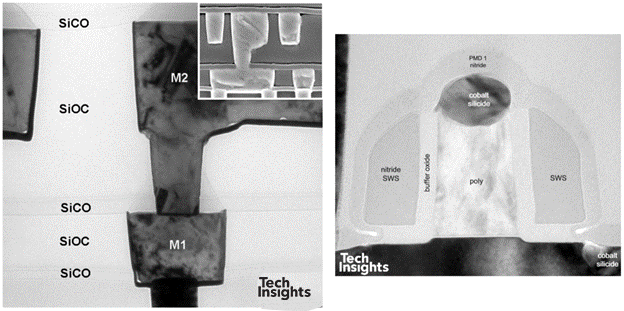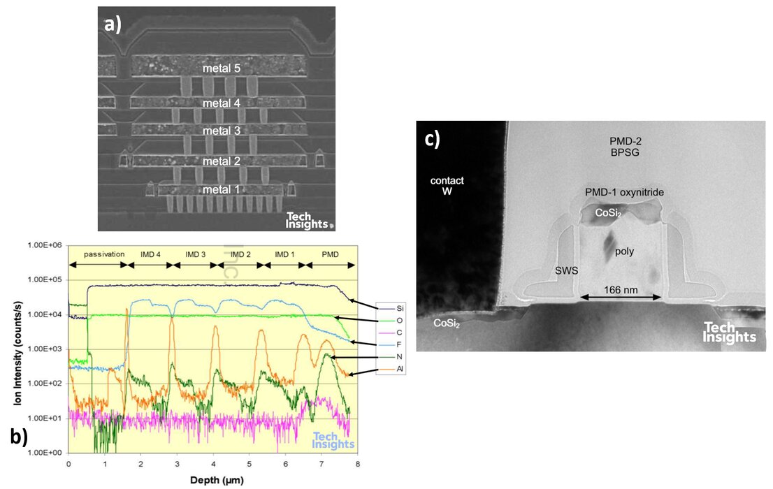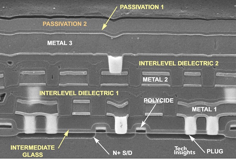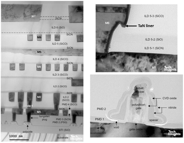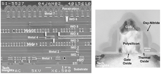 到了 0.18 µm(180 nm,2000 年):後段製程明顯改變,介電層堆疊中確認使用 FSG(k ≈ 3.6,相較於 SiO₂ 的 ≈ 4.0),Fab VI 啟用,並內建 300 mm 試產線。電晶體仍為 L 形 spacer,但矽化物改為 鈷矽化物(Co salicide),閘極長度約 130 nm。該 Lucent 晶片具有 五層金屬,我們也分析過 七層金屬的版本。