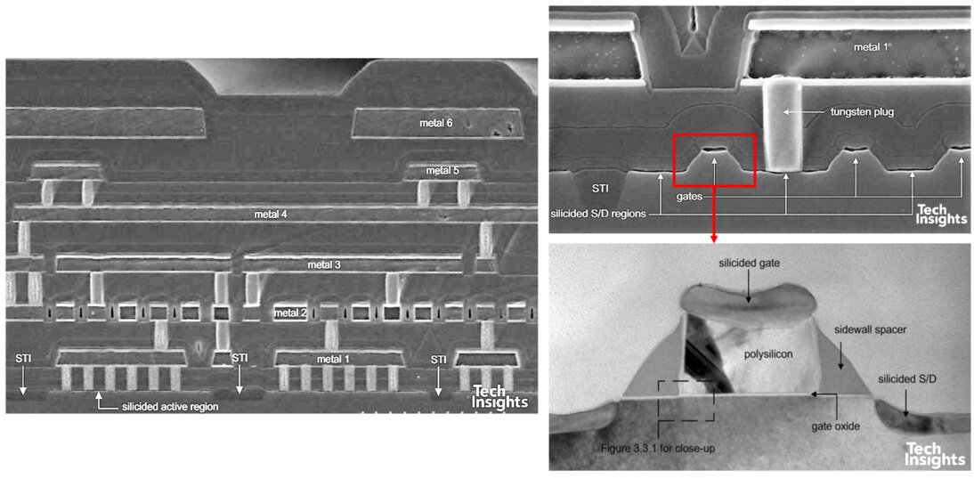 下一個完整節點為 65 nm,在此我們看到一個相當有趣的晶圓代工—客戶客製化案例。除了 Altera 的 FPGA,我們還辨識出一顆由 TSMC 代工的 德州儀器(TI)基頻處理器。雖然後段金屬堆疊相似,但在電晶體結構上則有明顯差異。