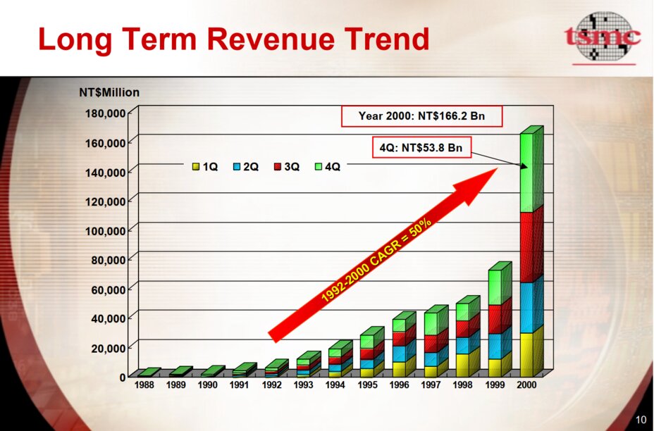 千禧年的高峰,2000 年是台積電的爆發年:營收較 1999 年成長 127%;1992–2000 年年複合成長率高達 50%。同年也推出了 150 nm 世代,延續半節點策略。在研發端,**130 nm(銅製程)**與 300 mm 晶圓製程同步進行,而 新竹 Fab 12 與 台南 Fab 14 也正施工中。