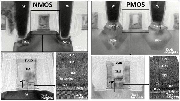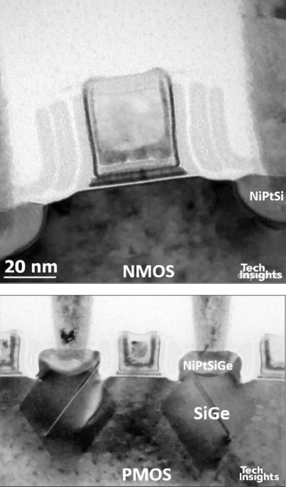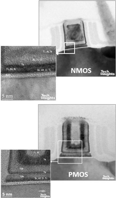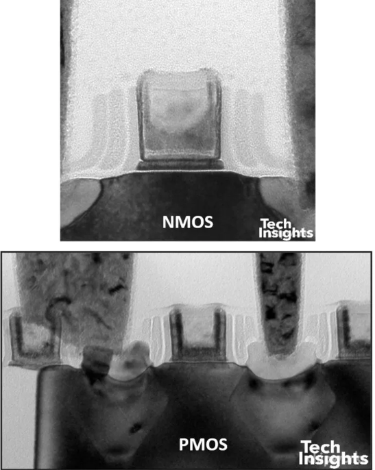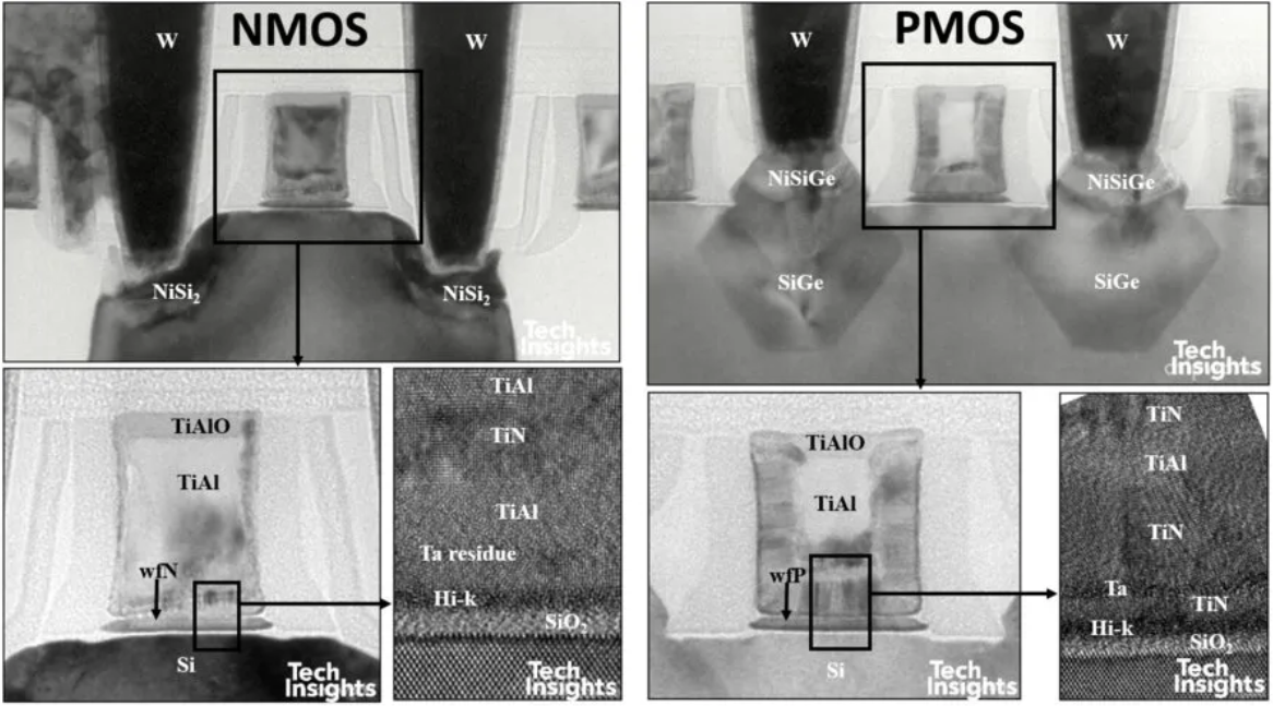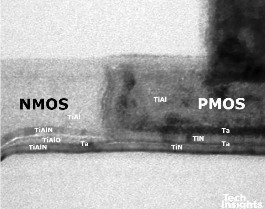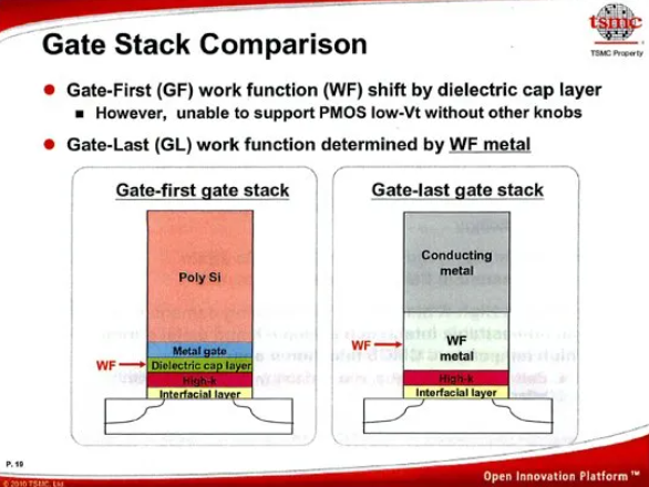 兩者的閘極堆疊相似但不完全相同,功函數材料也相近。一個顯著差異在於 金屬置換順序:Intel:先形成 PMOS 金屬,再於 NMOS 區域蝕刻回退並填入 NMOS 金屬;TSMC:順序相反,先 NMOS,後 PMOS