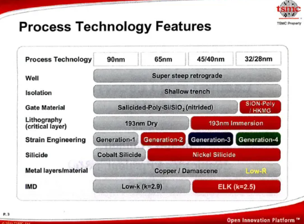 在 32 nm 研發起步後,TSMC 於 28 nm 世代同時進行 gate-first 與 gate-last 的 HKMG 兩條研發路線,並最終選擇 gate-last,此決策於 2010 年 2 月 Executive Forum 對外宣布。同時也揭露將提供三種版本:28HP(高效能,HKMG),28HPL(中速、低漏電,HKMG),28LP(低功耗,採傳統多晶矽閘極),之後又新增 行動應用導向的 28HPM(亦為 HKMG)。
