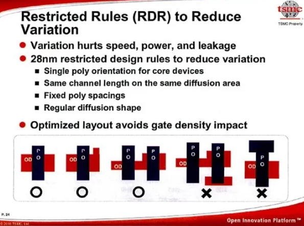 汲取 45 nm 與 40 nm 延遲的經驗,TSMC 導入 受限設計規則(Restricted Design Rules),以降低變異並提升良率。