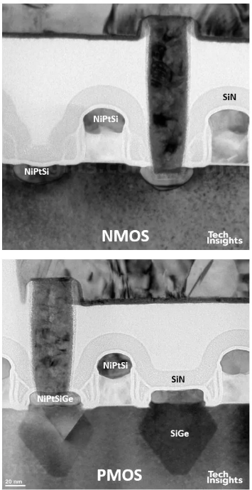 金屬置換順序回到 Intel 式流程(先 PMOS、後 NMOS);同時透過 **堆疊缺陷(stacking faults)**來強化 NMOS 應力。