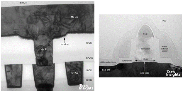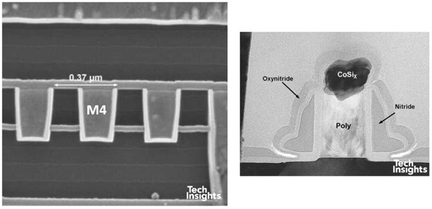 TI 的晶片具有明顯較厚的最上層銅金屬(1.6 µm),適合用於電感等 RF 元件;相較之下,FPGA 僅約 0.85 µm。下層金屬線距則較小,以符合 TI 的 65 nm 製程需求。除此之外,下層金屬/介電層堆疊相當類似。該處理器用於 Nokia 手機,而 TI 同時使用自家晶圓廠、UMC 與 TSMC 進行生產,推測其出貨量相當龐大。以下為電晶體結構比較。