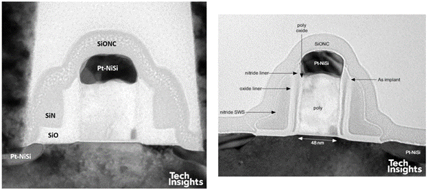 高-k 層及其介面氧化層先行形成(high-k first),再沉積假多晶矽閘極;DOS 間隔層演進為 三層 SiN/SiO/SiN。為符合低功耗定位,未在 PMOS 中使用 e-SiGe,但通道方向為 <100>。Altera 則在其 Stratix-V 產品中選擇 28HP。NMOS 外觀相近,但 PMOS 受惠於 e-SiGe,其 Ge 含量提高至約 50%: