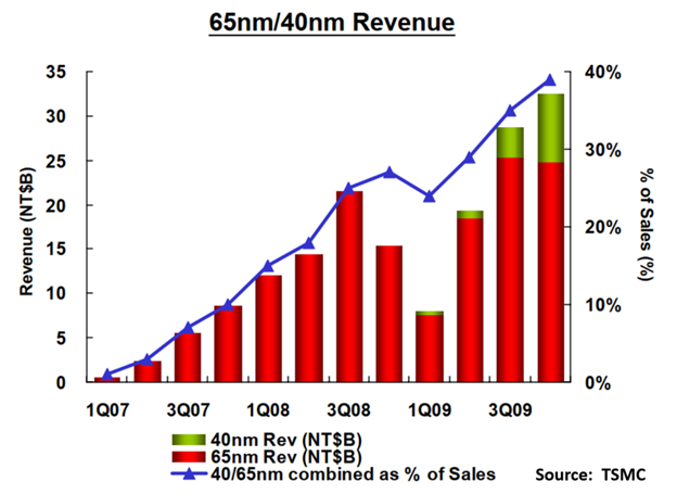 TSMC 在 45 nm 節點採取較為保守的路線,但仍包含重大變革——浸沒式微影、極低介電常數(ELK)材料與應力電晶體。這些變化似乎拖慢了 45 nm 的導入進度,以致該節點實際上被跳過,全面量產轉而集中於規劃中的 40 nm 半節點。根據當時的說法,問題不僅來自新製程步驟的導入,也與製程/版圖互動有關。Mark Liu 在 2009 年第二季法說會中表示:「在這一代,我們發現設計版圖風格非常重要,不同產品的良率差異相當大,而良率偏低的主要原因是設計對版圖的依賴性。所謂的 Design for Manufacturing,用白話說就是,當設計無法完全由設計規則描述時,我們需要額外的演算法軟體來優化版圖,以達到最佳良率。」同時也必須導入並建置新的量測技術(metrology)。2008–2009 年的全球金融危機亦對產業造成衝擊;2009 年全球 IC 市場下滑 10%,但在 2009 年第四季相較第一季出現 47% 的強勁反彈。這一影響在 TSMC 的 65/40 nm 營收曲線中表現得相當明顯。