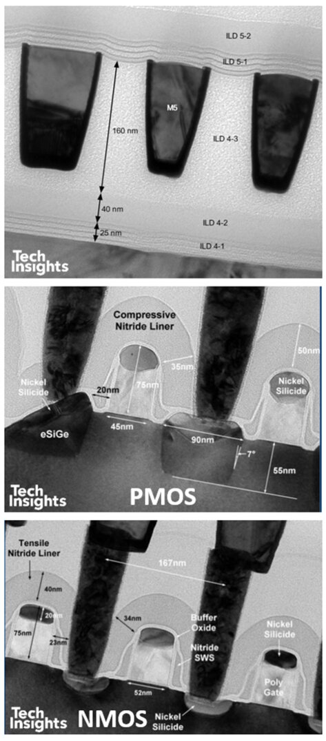 40 nm 製程承襲了 45 nm 的製程變革,但在公開尺寸上僅有極小的縮減。初期提供 低功耗(LP)、通用(GP)與高效能(GS)三種版本,後來又加入 超低功耗變體。對三種製程的分析顯示,GS 使用 雙應力 CESL 氮化層(DSL:NMOS 拉伸、PMOS 壓縮),並在 PMOS 中導入 嵌入式 SiGe 以增加壓縮應力;GP 亦使用 DSL,但 Ge 含量較低(19% vs. 26%);LP 則延續 DOS 間隔層與 <100> 通道方向,但不使用 DSL 或 e-SiGe。所有版本的下層金屬皆似乎採用 ELK(可能為 Black Diamond II)。