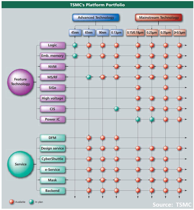 自創立初期起,TSMC 即在基礎邏輯製程之上提供多種變化版本,例如 **混合訊號、嵌入式記憶體、非揮發性記憶體以及高電壓製程;到了 2000 年代中期,這些產品被策略性地整合為兩大「平台」——先進技術(Advanced Technology)與主流技術(Mainstream Technology)。